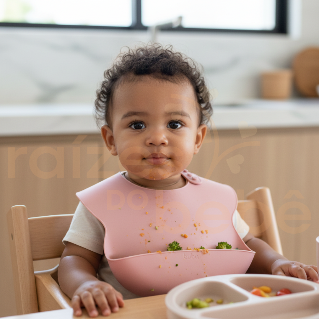 "O uso de babadores de silicone com coletor é um divisor de águas no método BLW. Ele dá segurança para a criança explorar o alimento sem que a mãe se preocupe com a sujeira excessiva, mantendo o ambiente de refeição tranquilo e organizado."